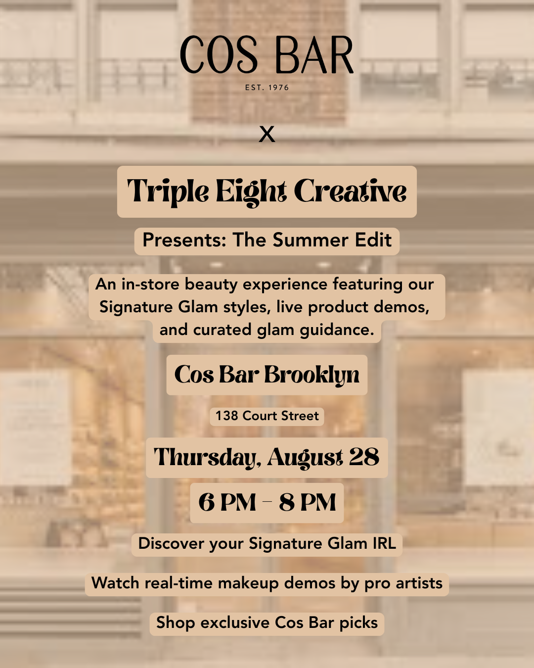 At Cos Bar Brooklyn, guests took our Signature Glam Quiz, discovered their personal style, and left not only with products but also with a lasting memory of the brand experience.